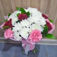 Стандартный (на фото): роза красная - 5 шт., гвоздика розовая - 6 шт., хризантема кустовая белая - 4 шт., рускус, фетр розовый. Примерный объем букета 30х30 см.